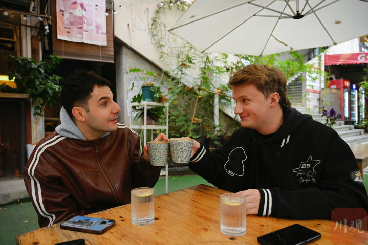 Martin(左)和Romain(右)一起在成都街头喝咖啡