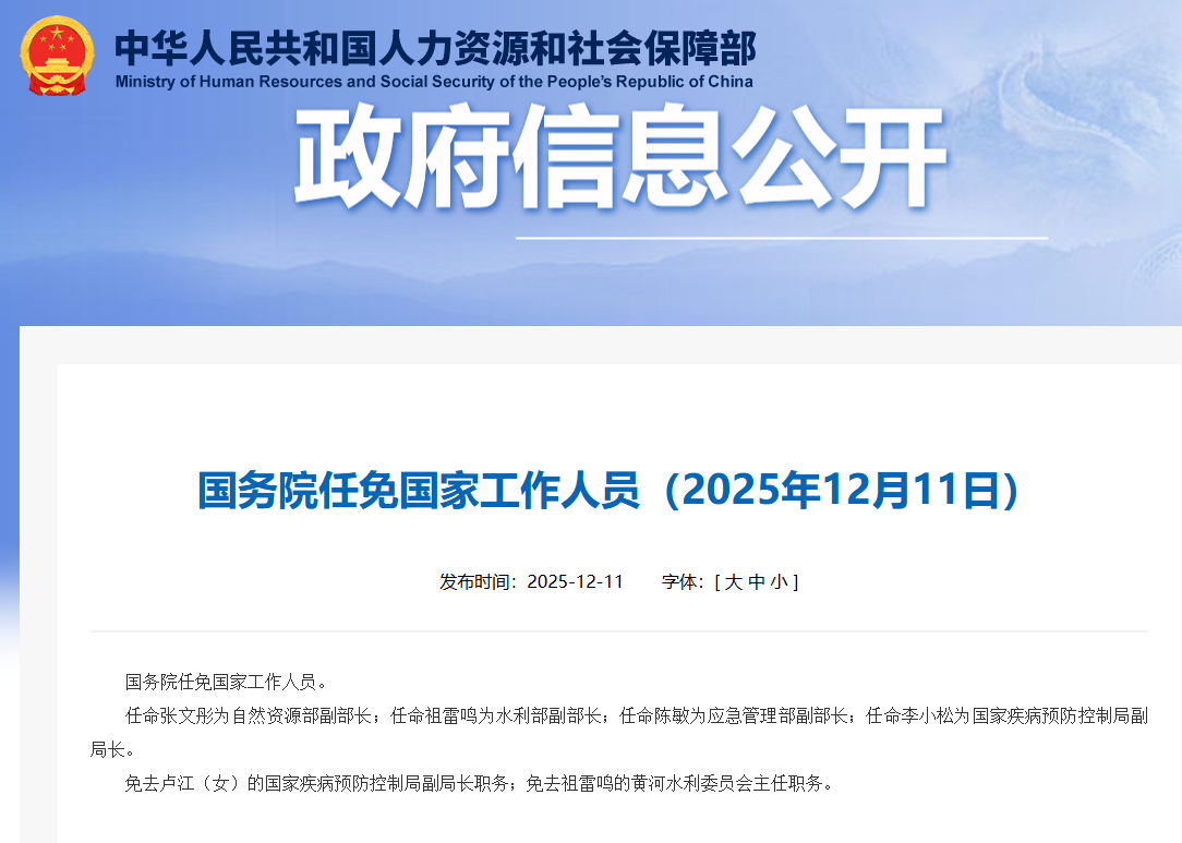 任命张文彤为自然资源部副部长;任命祖雷鸣为水利部副部长;任命陈敏为应急管理部副部长;任命李小松为国家疾病预防控制局副局长。